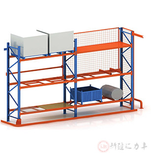重型货架式使用普通的一种重型货架,有很好的存取效率。固定架的储存密度较低,储存物品较重,须配合托盘和叉车使用,故又称为托盘式货架。在选用重型货架时,须考虑托盘和货物的尺寸、重量以及叠放的层数,以决定适当的支柱及衡量尺寸。此外,为提高空间利用率,可将通道宽度缩小,配合特殊窄巷道叉车,使储存空间合理化。